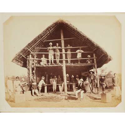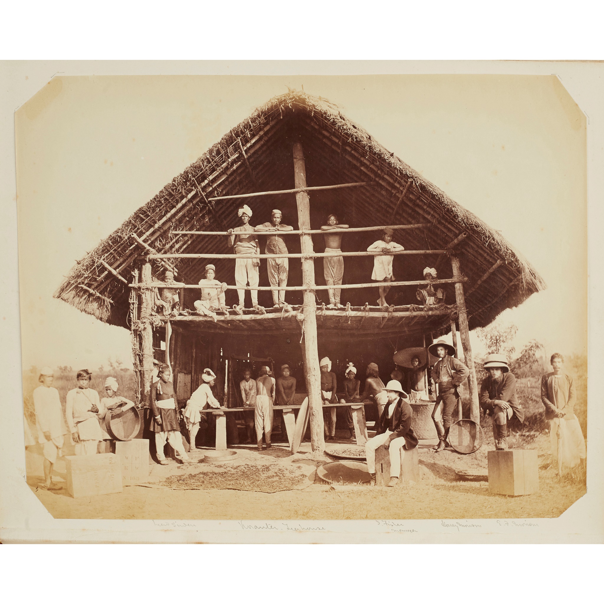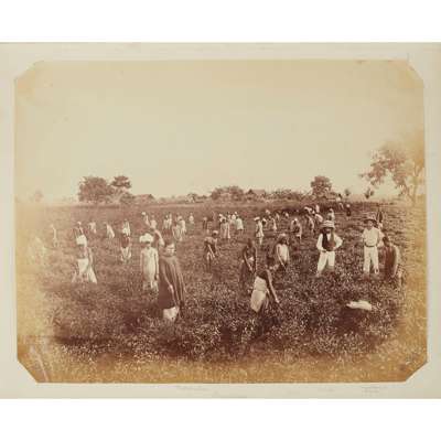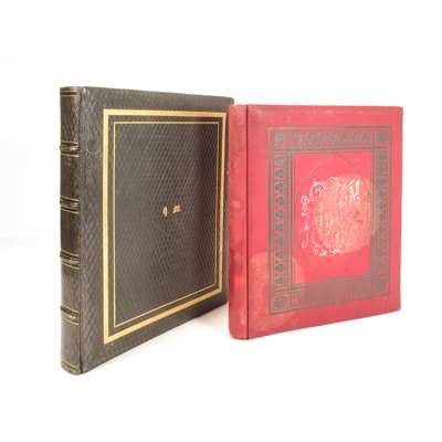the first album, c.1880, containing 32 photographs of India, including many images of tea plantations and the temples at Siliguri, albumen prints, between 17 x 10cm and 22 x 18.5cm, alongside many photographs taken in the United Kingdom, some fading; the second album dated c.1915, containing 185 photographs of Southern India, mainly silver gelatin prints, showing landscape, local people and Western emmigrants, many captioned to the photographs in ink, several severely faded, one torn, between 9 x 6cm and 21 x 16cm (2)