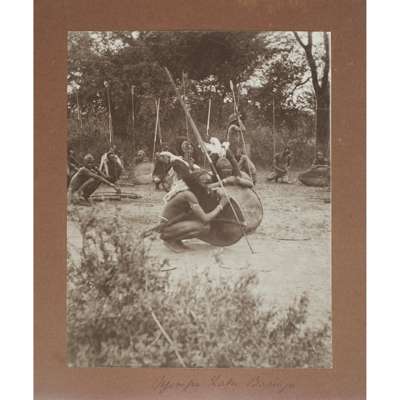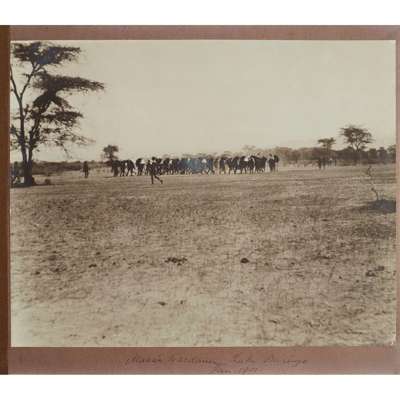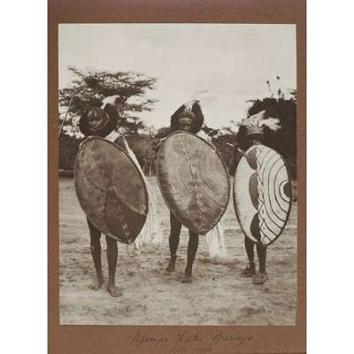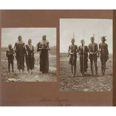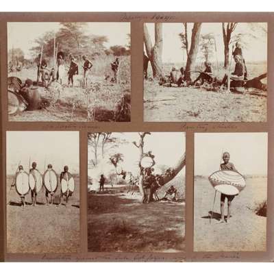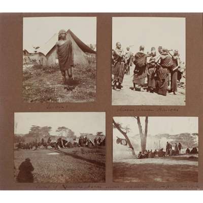 Album containing 152 photographs depicting a trip through Kenya, Uganda and Zanzibar, the largest measuring 25.5 x 20.5cm and the smallest 11 x 6.5cm, most images depicting local people, life and scenery including scenes in Mombasa, crossing rivers in Uganda, portraits of local people around Lake Baringo in traditional costume with shields and weapons, portraits of local people around Suswa, several hunting trophy photographs and photographs of local people and life in Zanzibar, contained in a red diced calf gilt album, 30 x 25cm