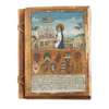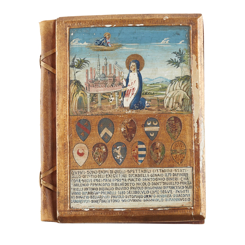 Siena, c.1890-1900, two painted boards attached by a leather pseudo-spine, the front panel of the present binding comprising, within a gilt border, an upper section of a kneeling figure within a landscape setting holding up a model of the city and a scroll bearing the words “This is my city”, Christ appears to the figure in the sky above, below are 11 coats-of-arms set in a gold background and 8 lines of text naming the tax officials for the period January 1479/80 to July 1480, the rear panel is divided into sub-panels, the two central containing a large Christogram and the lower containing what may have been a coat-of-arms, round these are panels of gilt sprays of flowers on a green background, all within gilt borders, the panels measuring 10 x 29cm, some flaking and chipping, particularly at the edges, some of which may have been by Joni who was in the habit of distressing his bindings
