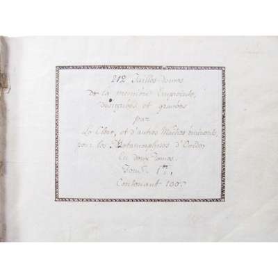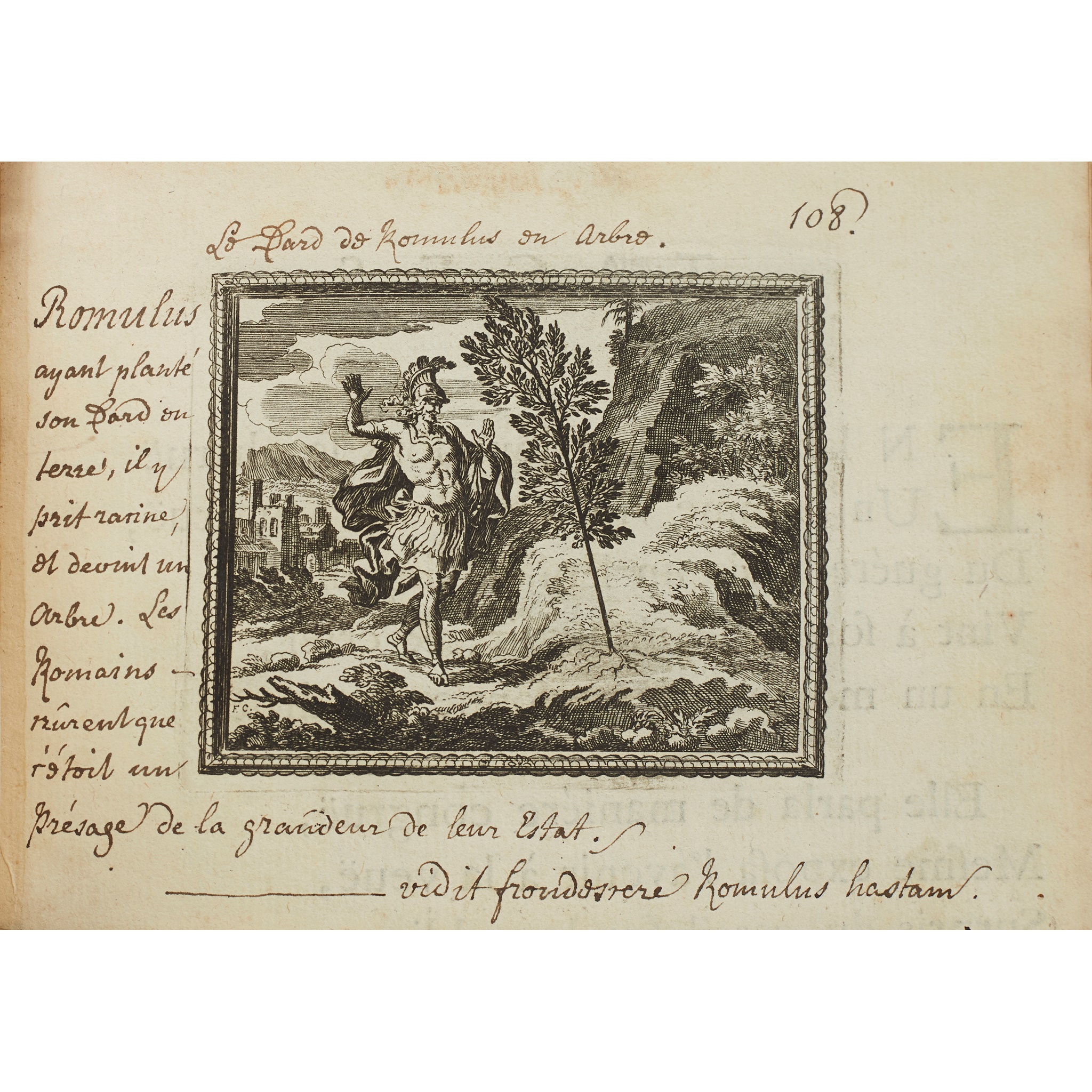2 volumes, each 17 x 13cm, containing 212 engraved illustrations for Ovid's Metamorphoses, each plate annotated to the reverse in a neat French hand, late 17th century half calf with red morocco gilt labels to spines, volume 1 with the bookplate of Wm. Michel Sale, volume 2 with Sale's ownership signature and volume 2 with the bookplate of Thos. Pennington of Bledlow