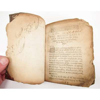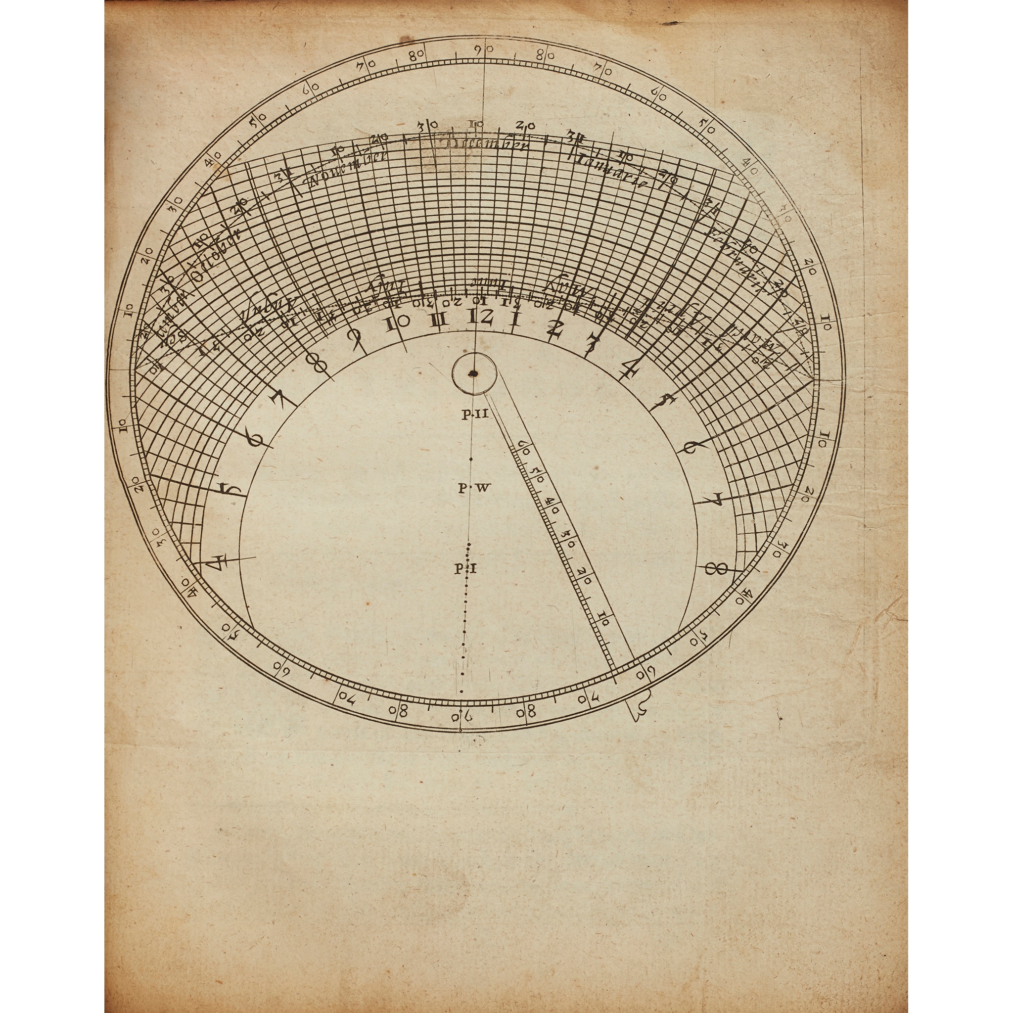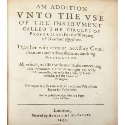 [London: Elias Allen, 1632], First edition, A1 (blank), A3- 4, B1-X4, 3 engraved plates, with three final leaves of diagrams and a final errata leaf with heading "The translator to the readers", [ESTC S11364], 3 engraved plates, with three final leaves of diagrams and a final errata leaf with heading "The translator to the readers", lacking printed and engraved titles, title supplied in an early hand to blank A1, upper corner of first 8 leaves creased and frayed with slight loss of margin, small adhesion affecting running title of A4 verso and adhesion transfer to following plate, some staining and browning to margins; bound with. Oughtred, William. An Addition unto the Use of the Instrument called the Circles of Proportion for the working of nauticall questions. London: Augustine Mathewes, 1633. 4to, A1-B3, seemingly lacking B4 ; [bound with] Oughtred, William. To the English Gentrie and all others Studious of the Mathematics. [London : A. Mathewes, 1634?], A1-D4 (with A2-A3 misbound), final leaf with errata slip pasted to lower part of leaf, adhesion resulting in loss of a few letters, [ESTC S119424], contemporary vellum, soiled and somewhat creased, early ownership signature to first work of James Stewart