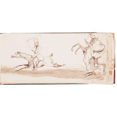 manuscript, oblong 8vo 24 x 10.5cm, 15 leaves, mostly illustrations telling the tale of two hapless horsemen, dated February 20th 1827, contemporary red half morocco