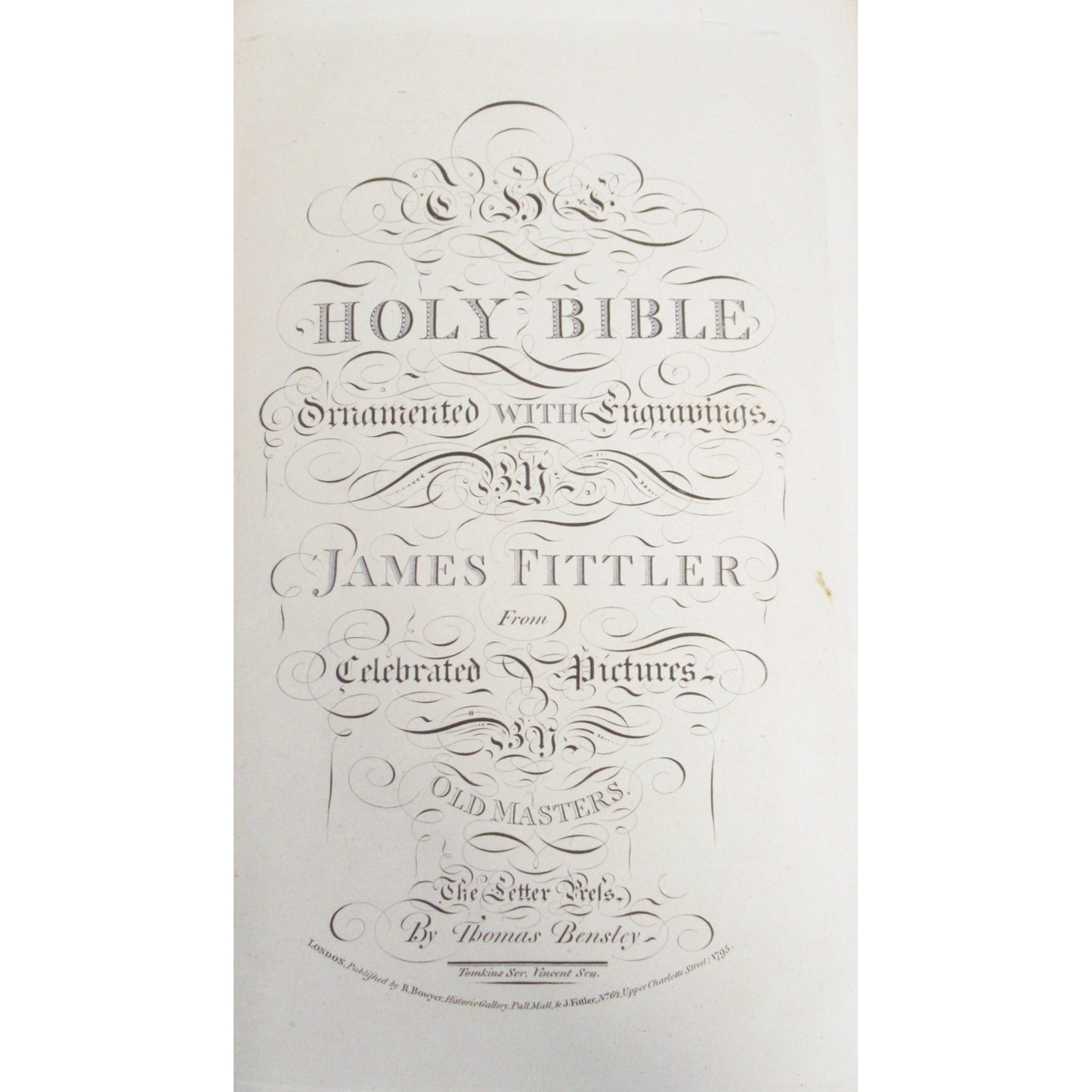 London: R. Bowyer, 1795-1792. 4 volumes (3 comprising the Bible and 1 comprising the Book of Common Prayer), 8vo, 3 frontispieces, 3 engraved titles, engraved contents pages, and others, bookplates, contemporary red morocco gilt, some slight scratching to covers, spines a little faded (4)