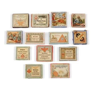 comprising: Pythagoras. London, third edition; Der Kopfzerbrecher, third edition; Sphinx; Rhuig Blut; Alle Neune; Kreuzspiel, with one key booklet only (of 2); Zorn-Brecher. New York; Der Blitzableiter; Kreisrätsel; Ei des Columbus. New York; Quälgeist. New York; Grillentöter. New York; Geduldprüfer. New York, lacking box lid; all in original pictorial boxes, a little rubbing to boxes with occasional box sides lacking (13)