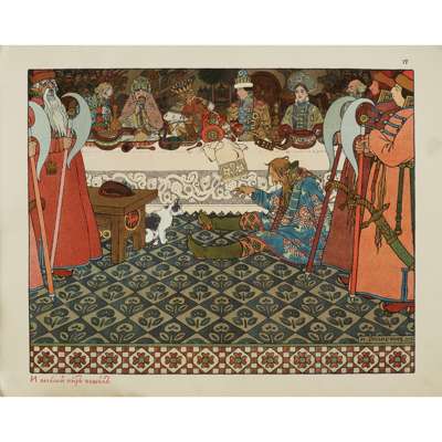 St Petersburg: Expeditsii Zagotovlenya Gosudarstvennykh Bumag, 1905. Oblong 4to, chromolithographed boards and pages by Bilibin, a little chipping, dust-soiling and fading to covers, one initial with light pencil scribbles