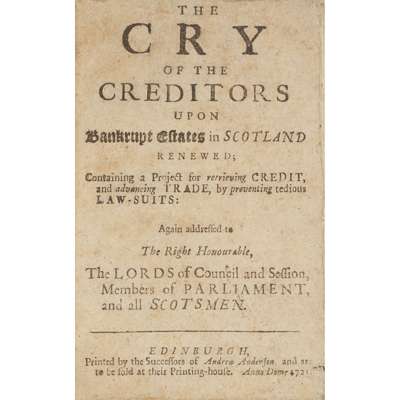 The Cry of the Creditors upon Bankrupt Estates in Scotland. Edinburgh: the Successors of Andrew Anderson, 1721. A little dust-soiling and trimming to headers, [ESTC T192280, listing only onle copy (NLS)]; Stuart, Charles Edward A Full Collection of all the Proclamations and Orders published by the Authority of Charles Prince of Wales... [Glasgow:] 1745. [ESTC T71882]; Lyon, Robert A Genuine Copy of the last Words and dying Speech of the Reverend Mr. Robert Lyon... [Edinburgh, 1746?] Drop-head title, [ESTC T203837, listing 8 copies]; Balmerino, Arthur Elphinston, Lord, et al. True Copies of the Papers wrote... London, 1746 [being part i of the previous item]; 'Montgomery, Betty' [i.e. William Cullen] A Funeral Oration in Honour of Miss Jeany Muir [i.e. Dr John Clark, Edinburgh physician] A Celebrated Lady of Pleasure. Amsterdam [Edinburgh?, n.d.] Disbound, some dust-soiling [ESTC T128536, listing only 3 copies of this satire composed by one doctor regarding another]; A Few Passages, Shewing the Sentiments of the Prince of Hesse, and General Hawley. London, 1746. [ESTC N31408, listing 7 copies]; 'Phileleutheros' An Answer to a Letter address'd to The Archbishop of York. Edinburgh, 1745. Half-title, [ESTC N1713 listing 9 copies]; The Norwich Dream: or, A Vision, Concerning the present Rebellion... London: S. Layman, [n.d. but 1745?] Unrecorded in ESTC, the University of Aberdeen appears to have a variantly titled copy; George II, King Anno Regi Georgii II Regis...Decimo Septimo... Edinburgh: Richard Watkins, 1744; 'Friend of Great Britain' A Candid and Impartial Discussion of the False Reasonings...of two late Pieces... London: M. Cooper, 1747. [ESTC T166098, listing 10 copies of this variant]; 'Aretine' [i.e. William Murray Earl of Mansfield] The Thistle... London: H. Carpenter, 1747. [ESTC T126500]; 'A Briton' National Union Recommended... Edinburgh, 1747. [ESTC T59151 listing 9 copies]; all 8vo, bound as one volume in 18th century quarter calf