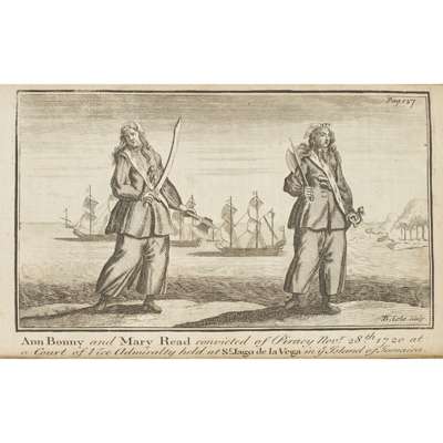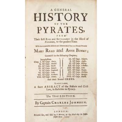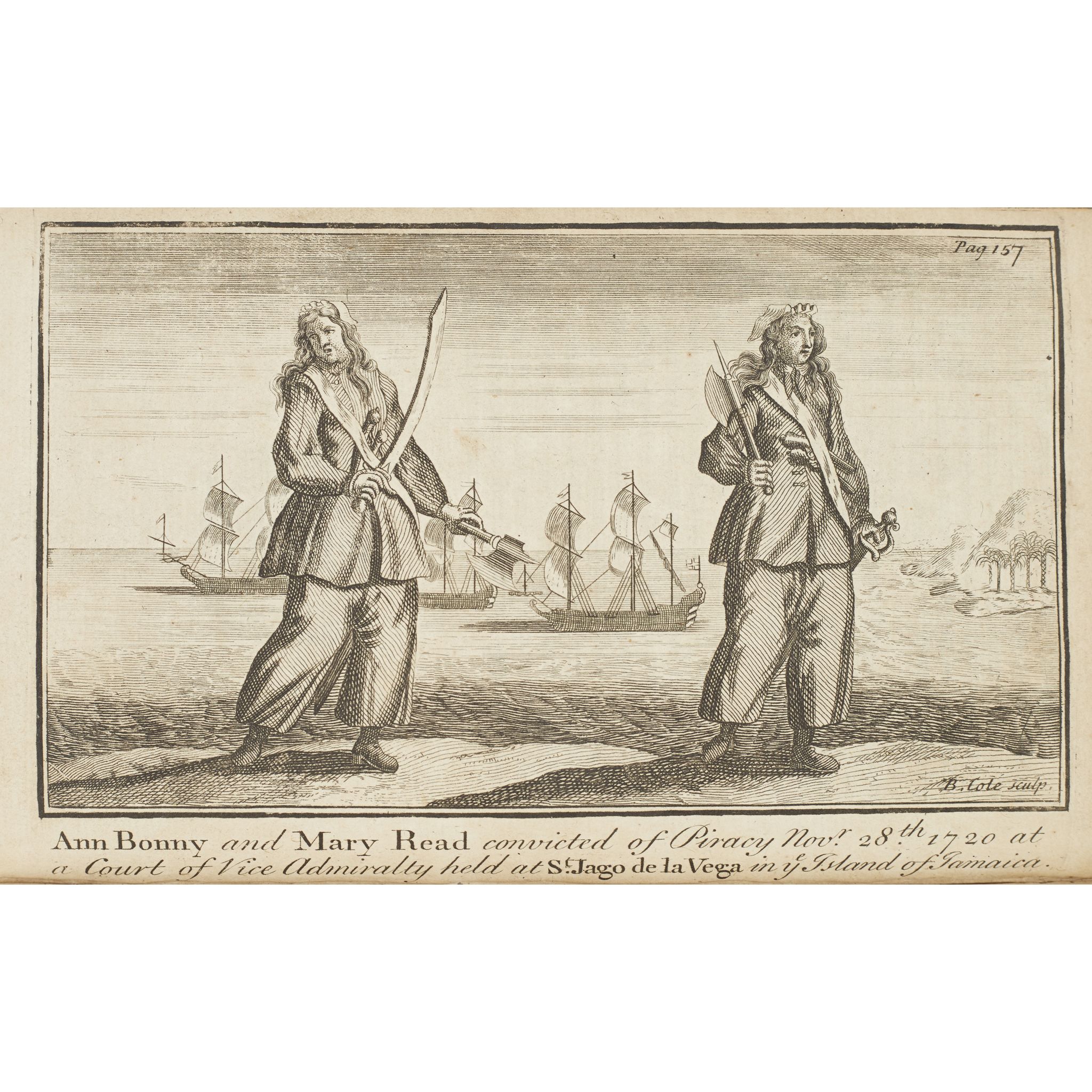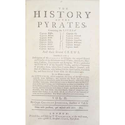 London: T. Warner, 1725. Third edition, 8vo, 3 plates (including one folding), contemporary calf, spine label chipped, some slight dampstaining and browning, closed tear to folding plate [ESTC T71965, listing 8 copies]; [Idem] The History of the Pyrates. London: T. Woodward, [n.d. but 1728]. 8vo, being 'volume ii' (of the fourth edition?), lacking a1, in uniform calf [ESTC T71966, no collation given but: [14], 144, 161-272, 257-413, [3], without plates]; bookplates (2)