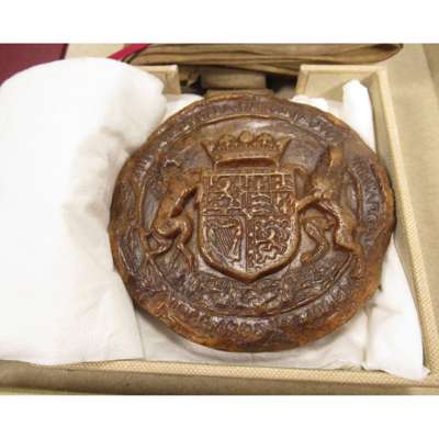 Charter in Latin, Confirmation of an earlier Charter given by Magister John Edmonston of Newtown (Haddingtonshire) to William Murray, Knight, of all the lands and town of Newtown lying in the Lordship and Regalitie of Musselburgh in the district of Edinburgh, dated at 'Halierindhous' (Holyrood House), Edinburgh, 15th July 1620, complete with the rare seal of Charles as Prince of Scotland, with the stamped signatures of James and Charles, and holograph signatures of Alexander Seton, 1st Earl of Dunfermlin, Lord Chancellor; John Erskine (2nd or 7th Earl of Mar, Lord High Treasurer; Thomas Hamilton, Earl of Melrose, Secretary of State; John Murray, 1st Earl of Annandale, Keeper of the Privy Purse, and William Oliphant, Lord Newton, Lord Advocate, on vellum, 49 x 37cm, folded, with seal attached, preserved in folding cloth box with black morocco label