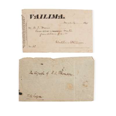 a voucher with the printed heading 'Vailima', filled out by Stevenson and addressed to the Michigan trader Harry J Moore, asking him to deliver $4 to Metu, probably a Samoan household servant, 1 page, small oblong 8vo, 8 x 12.5cm., Vailima [Samoa], 14 March 1891