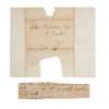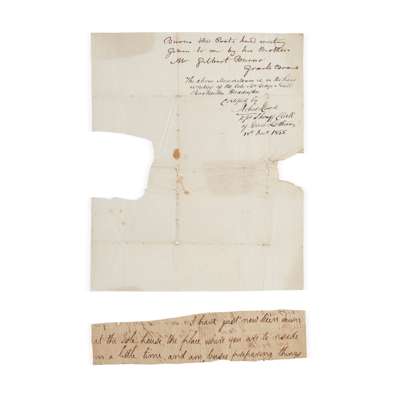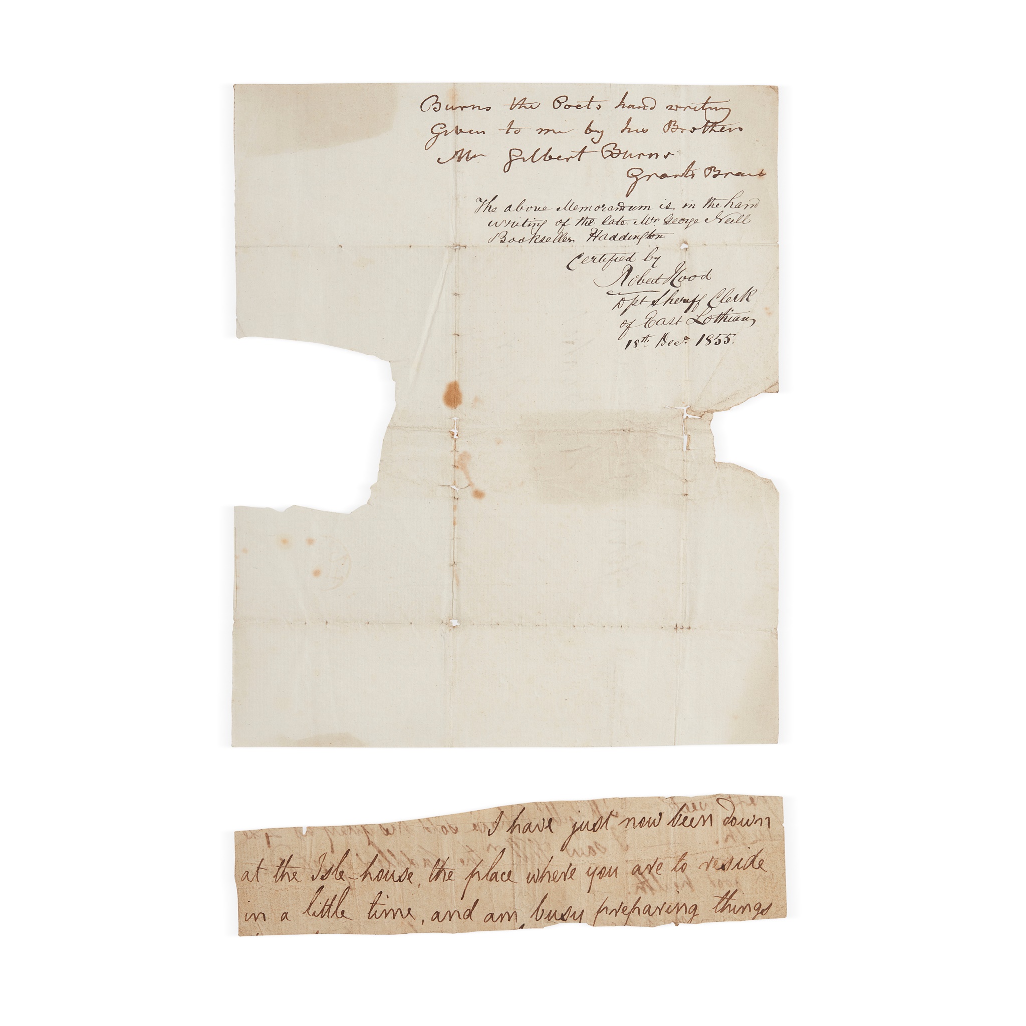 consisting of a folded post marked envelope addressed in Burns' hand to John Ballantine Esq., Banker, Ayr, and a folded strip cut from a letter (receipt unknown) with three lines on each side in Burns' hand. Envelope sheet with two pieces torn from it. Manuscript note inside records it having been given to one George Neill, bookseller in Haddington, by Burns' brother Gilbert of Grants Brae. This is followed by lines written by Robert Hood, Deputy Sheriff Clerk of Haddington, certifying the note about the donation to be in Neill's handwriting. Gilbert Burns was factor at Lennoxlove, Haddington, and lived latterly at Grants Brae. The folded strip in Burns' hand refers to Burns having sold Gilbert's grey (horse), Will[ia]m the saddler and having visited the 'Isle-house, the place where you are to reside a little time'