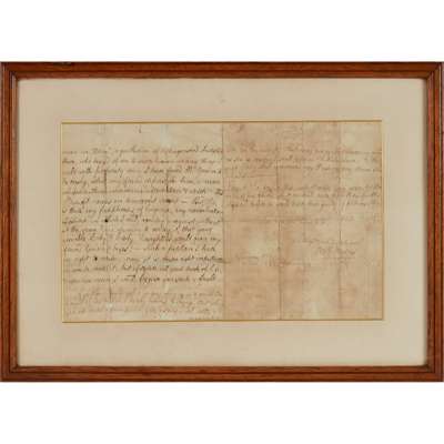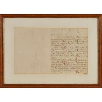 asking for a favour, not for himself, but for a strolling player to whom he has been introduced, Mr Guion, "Now Sir, is there any periphrasis of language, any circumlocution of phrase, in which I could convey a request, without at the same time seeming to convey it, that your amiable Lady & lovely Daughters, would grace my friend Guion's boxes ?" and in return making a charming and mock solemn undertaking "I hereby promise & engage, that when you are made a commissioner of the Customs, I will write a congratulatory Ode on the subject; that every one of your charming girls as she is married, shall have an Epithalanium, & that your Lady shall command my Muse on any theme she pleases...", 3 pages, Thursday Nov. 7, 24 x 39.5cm., framed and double glazed, one page laid down, obscuring address panel, some splits and short tears at folds, some repaired