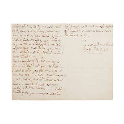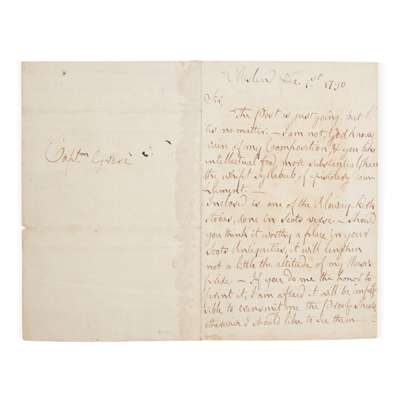 To Captain Francis Grose, Ellisland, 1 Dec. 1790, 2 pages, 4to, (190 x 121mm), bifolium, docket (traces of paste where previously pasted into an album), about sending the manuscript for Tam O'Shanter. Opening with a graceful excuse for a hurried letter ('I am not, God knows, vain of my composition, & if you like intellectual food more substantial than the whipt syllabub of epistolary compliment'), Burns refers to the enclosure which originally accompanied the letter of 'one of the Aloway Kirk stories, done in Scots verse. Should you think it worthy a place in your Scots Antiquities, it will lengthen not a little the altitude of my Muse's pride.' He requests Grose's discretion in reproducing his work, noting that 'Authors have too often very little to say in the disposal of this world's affairs, but it would be very hard if they should not be absolute in their own works'. Grose's 'draft of Kilwinning is finished, but not come to hand. I shall send it you the minute it reaches me.'