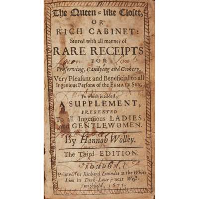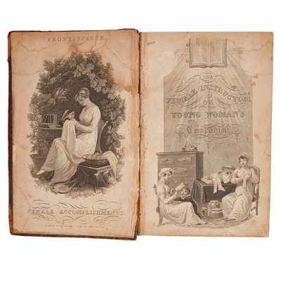For preserving, candying and cookery. London, Richard Lowndes, 1675. 12mo, third edition, contemporary quarter calf, calf rebacked, lacking A2 and A3 and many other leaves, hinges split, early ownership signatures to reverse of title, a little browning; The Female Instructor or Young Woman's Companion. Liverpool: Nuttall, Fisher & Dixon, 1817. 8vo, frontispiece, engraved title-page, 7 plates, contemporary half calf, some light dampstaining to frontispiece and title-page, some darkening and slight soiling throughout, upper cover detached (2)