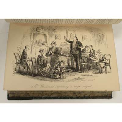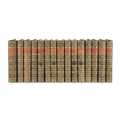 London: Chapman and Hall Ltd., [n.d.] 8vo, 15 volumes comprising: The Old Curiosity Shop; Our Mutual Friend; Nicholas Nickleby; American Notes; A Child's History of England; Barnaby Rudge; Edwin Drood & Christmas Books [together]; Little Dorrit; Bleak House; David Copperfield; Oliver Twist; Pickwick Papers; Great Expectations; Martin Chuzzlewit; all with plates, late 19th century green half calf gilt with red morocco gilt labels to spines, spines a little faded