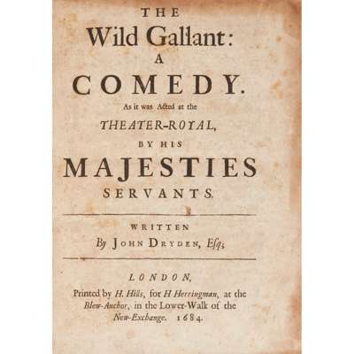 Collection of eleven plays, ten of them by Dryden, one the first edition of his adaptation of Shakespeare's Troilus and Cressida: Dryden, John The Wild Gallant: a Comedy. H. Hills for H. Herringman, 1684, [Wing D2401; MacDonald 72c]; Amboyna: a Tragedy. T.N. for Henry Henringman, 1673, first edition, [Wing D2232; Macdonald 79a; Pforzheimer, 314]; The Rival Ladies: a Tragi-Comedy. T.W. for H. Herringman, 1693, [Wing D2349; Macdonald 67d]; Troilus and Cressida, or, Truth found too late. A Tragedy. For Abel Swall and Jacob Tonson, 1679, first edition of Dryden's version, [Wing D2389; Macdonald 84aii; Pforzheimer, 915], without the single leaf with the Duke poem found in some copies, slight printing flaw or smudge affecting last line of b1 verso; and seven others