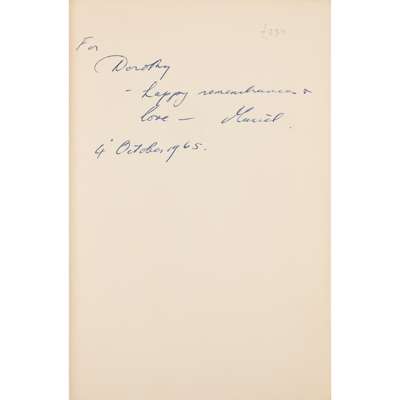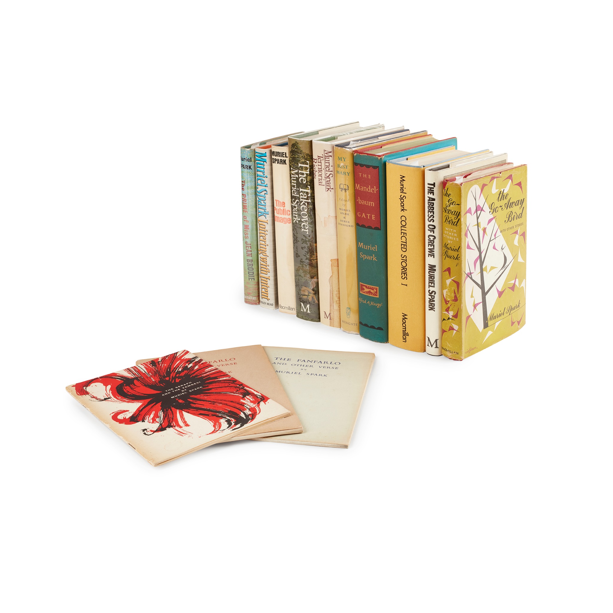 The Mandelbaum Gate. New York: Alfred A. Knopf, 1965. First US edition, 8vo, signed and inscribed: "For Dorothy - happy remembrances & love - Muriel, 4. October 1965" [Dorothy Golding was the American agent of Muriel Spark], dust-jacket not price-clipped but with slight chipping to spine ends; [Idem] The Prime of Miss Jean Brodie. London: Macmillan & Co. Ltd., 1961. First edition, 8vo, dust-jacket not price-clipped; [Idem] The Fanfarlo. Aldington: The Hand and Flower Press, 1952. First edition, pamphlet in original wrappers; and a second edition copy; [Idem] - Derek Stanford My Best Mary. London: Allan Wingate, [1953]. First edition, 8vo, dust-jacket not price-clipped but with a few small chips and tears; [Idem] The Go-Away Bird. London: Macmillan & Co. Ltd., 1958. First edition, 8vo, dust-jacket not price-clipped but spine slightly chipped; [Idem] The Seraph and the Zambesi. Philadelphia: J.B. Lippincott Company, [n.d.] Pamphlet in original wrappers; [Idem] Collected Stories I. London: Macmillan, 1967. First edition, 8vo, dust-jacket not price-clipped; [Idem] The Public Image. London: Macmillan, 1968. First edition, 8vo, dust-jacket not price-clipped; [Idem] The Abbess of Crewe. London: Macmillan, [1974]. First edition, 8vo, dust-jacket not price-clipped; [Idem] The Takeover. London: Macmillan, [1976]. First edition, 8vo, dust-jacket not price-clipped; [Idem] Territorial Rights. London: Macmillan, [1979]. First edition, 8vo, dust-jacket not price-clipped; [Idem] Loitering with Intent. London: The Bodley Head, [1981]. First edition, 8vo, dust-jacket not price-clipped (13)
