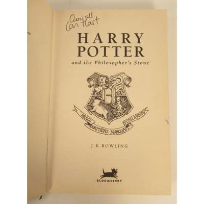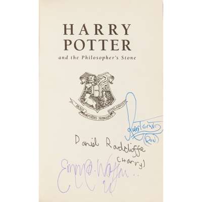 London: Bloomsbury, 1997. Twenty-fourth impression, 8vo, signed by members of the Harry Potter film cast: Daniel Radcliffe [Harry], Emma Watson [Hermione], Rupert Grint [Ron] and Ian Hart [Professor Quirrell], original paper-covered boards