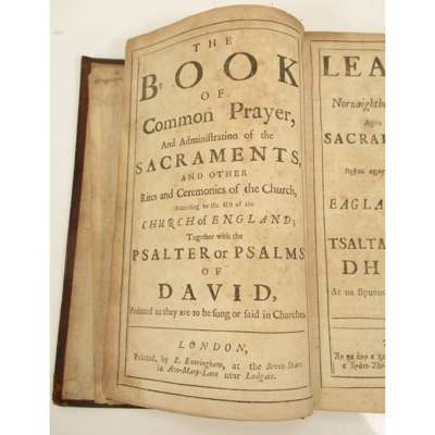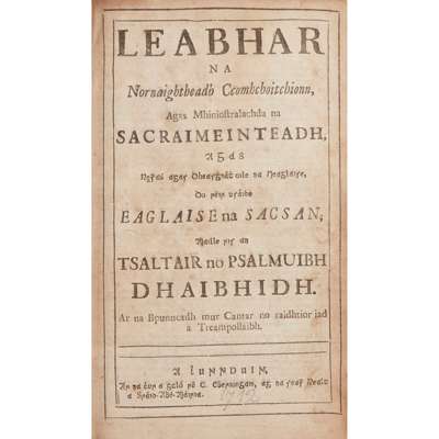 The Book of Common Prayer... Leabhar na Nornaightheadh Ccombchoitchionn... Tsaltair no Psalmuibh Dhaibhidh. Ar na bpunncadh mur cantar no raidhtior iad a Tteampollaibh. London: E. Everingham, [1712]. 8vo, the Psalms in Irish only, 8pp. appendix inserted at the end, contemporary calf, eighteenth-century inscription, browned, upper cover and front endpaper detached, lower joint cracked