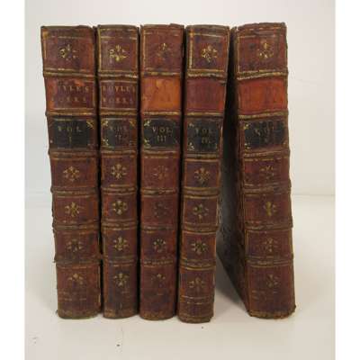 London: for A. Millar, 174. 5 volumes, folio, engraved frontispiece portrait, titles in red and black,15 folding engraved plates, contemporary mottled calf, some joints cracked, lacking a few lettering-pieces [Fulton, Boyle 240]
