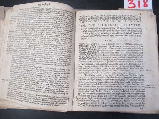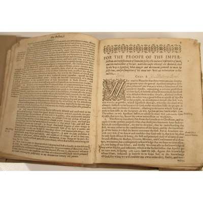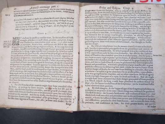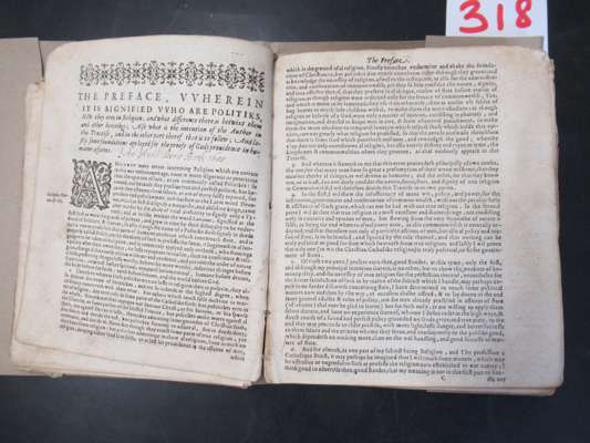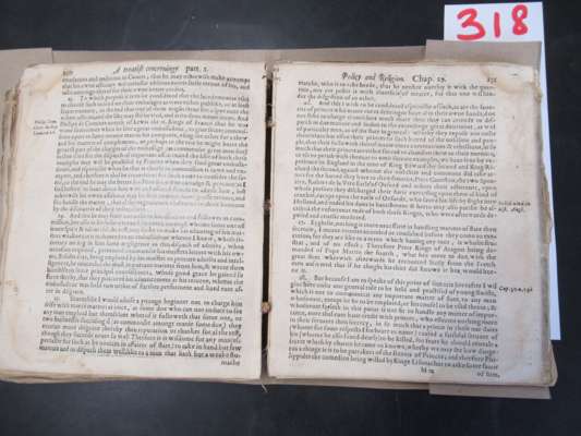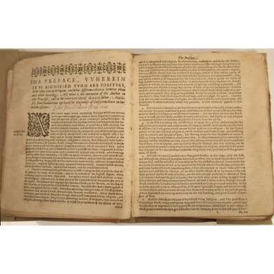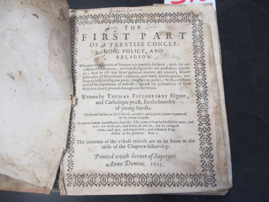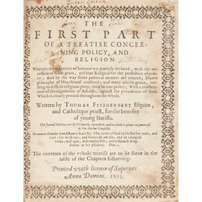 The First Part of a Treatise Concerning Policy and Religion. [Douai:] Printed with licence of Superiors, 1615. Part 1 only, second edition, Father John Huddleston's copy, signed by him four times, signed twice and inscribed with a a Latin motto on title, also signed and dated 1688 on B4 verso ('John Huddlestons Book 1688') and C4 recto ('John Huddlestons Book'), title within woodcut border, lacks R1-4, numerous leaves loose, title soiled, some slight worming to inner margins, browned throughout, ink inscription on front free endpaper ('1630 decemb; 6s 6d. JB'), contemporary boards, leather removed from boards, lacks spine, some edges creased or frayed, [STC 11018); sold not subject to return