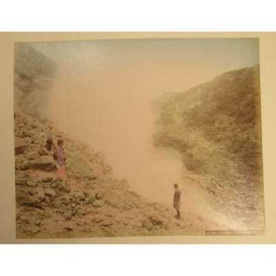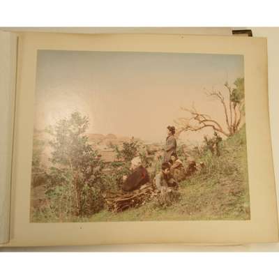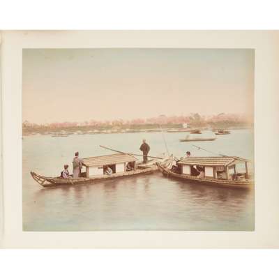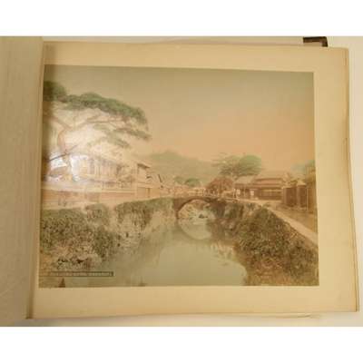c1890-1910, including Nakajima-Gawa Nagasaki, posed photographs of local life and people, Geiko and Maiko girls and women, Kyoto temples, Choshi, Mount Fuji, tea plantations and other images, all with hand-colouring, each c.26 x 20.5cm, a little fading, contained in a Japanese red lacquer album with goose and flower motifs to the upper cover in painted ivory and gilt