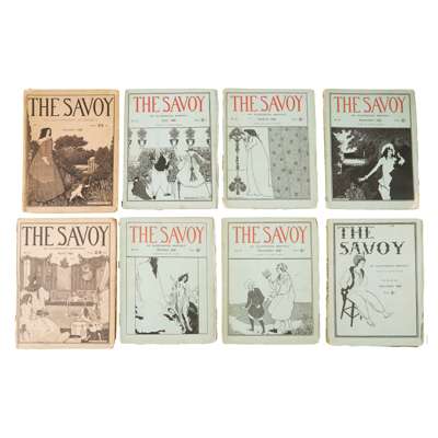 London: Leonard Smithers, 1896. 8 volumes [all published], edited by Arthur Symons, numbers 1-2 in original pink decorative boards, numbers 3-8 in original blue decorative wrappers, uncut, illustrations by Aubrey Beardsley, worn, a little chipped, lower wrapper of no 8 detached