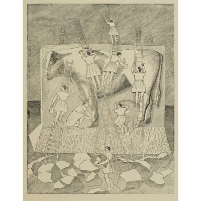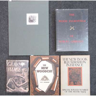 Craig, Edward Gordon A Production, being Thirty-Two Collotype plates of designs projected or realised for The Pretenders of Henrik Ibsen. Oxford University Press, 1930. Large folio, one of 605 copies, 32 plates, original red cloth gilt, uncut, slightly faded, extremities slightly rubbed; Gibbings, Robert The Wood Engravings. 1959. 4to, original black cloth with red lettered plastic wrap-around; Burnett, David Twelve Poems. The Old School Press, 1994. Folio, wood engravings by Sister Margaret Tournour, number 77 of 135 copies signed by artist and author, original green cloth, uncut, covers slightly flecked; Farleigh, John Graven Image. 1940. 8vo, pictorial boards, dust-jacket, owner's inscription to endpaper; Salaman, M.C. The New Woodcut. The Studio, 1930, 4to, original wrappers; Pichon, L. The New Book-Illustration in France. The Studio, 1924. 4to, original wrappers; Spencer, Gilbert The Ten Commandments. Stanford Dingley: The Mill House Press, 1934. Large folio, one of 75 copies, 13 tipped-in plates, original cloth, the binding slightly soiled and spotted (7)