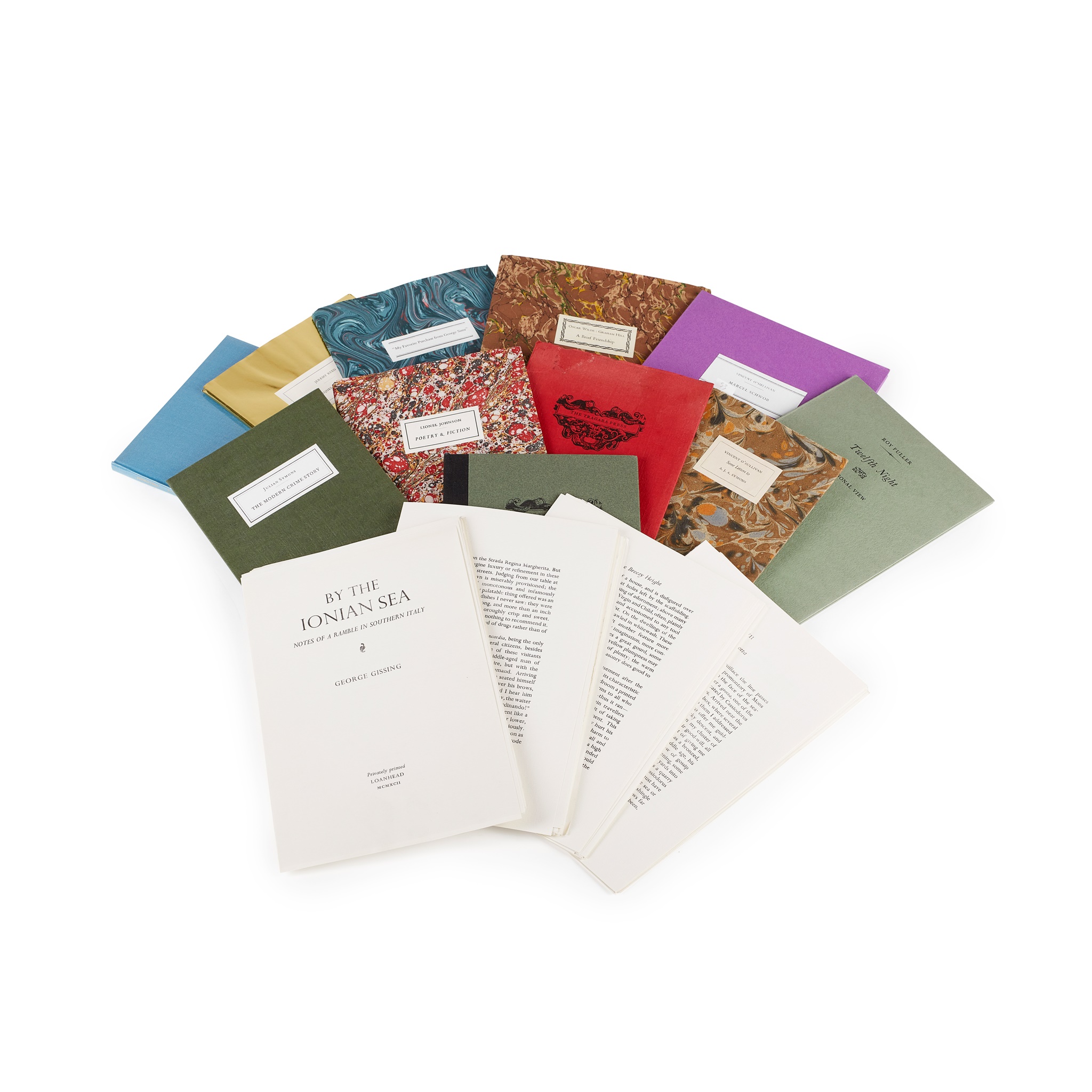 Comprising: O'Sullivan, Vincent Some letters ... to A.J.A. Symons. 1975, number 86 of 130 copies; Wilde, Oscar Hellenism. 1979, number 65 of 95 copies, blue cloth; Symons, Julian The Modern Crime Story. 1980, number 57 of 125 copies; Johnson, Lionel Poetry & Fiction. 1982, number 26 of 95 copies; Fuller, Roy Twelfth Night. 1985, number 41 of 135 copies; Reed, Jeremy Baron Jacques d'Adelsward Fersen. 1997, number 62 of 75 copies, unsigned, original gold wrappers; Mason, Jeremy Oscar Wilde: Graham Hill. 1982, number 6 of 75 copies; [Various authors] My Favorite Purchase from George Sims. 1998, one of 20 copies; O'Sullivan, Vincent Marcel Schwob. Memories and Letters. 2004, limited to 60 copies, this one a printer's proof copy; Anderson, Alan The Tragara Press 1954-1979. 1979, number 11 of 135 copies, signed, quarter cloth; The Tragara Press 1979-1991. 1991, 2nd impression, limited to 50 copies; Gising, George By the Ionian Sea. 1992, page proofs, with a few manuscript corrections, unbound (12)