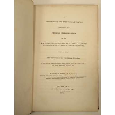 Baltimore: Armstrong and Berry, 1841. 8vo, first edition, presentation copy inscribed to the front free-endpaper: "Presented to Miss Orzella Louisa Matilda Cecilia Catherine Harris with affectionate regards of her father, The Author, Balto. Oct. 21st. 1841", in fine 19th century red morocco gilt with the title to the upper cover; [Idem] The Principles and Practice of Dentistry. Philadelphia: P. Blakiston, Son & Co., 1889. Twelfth edition, 8vo, original brown cloth gilt (2)
