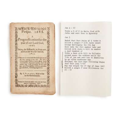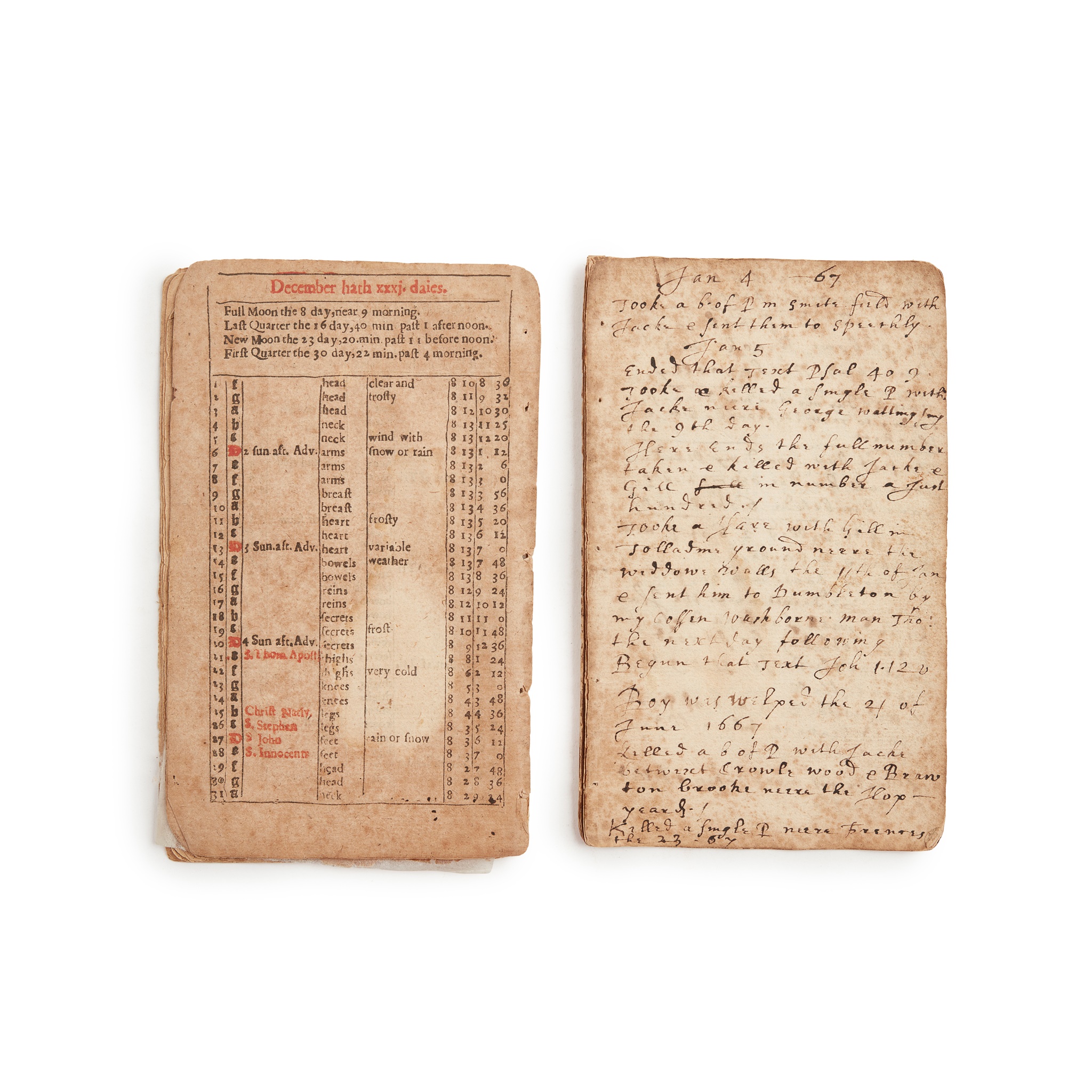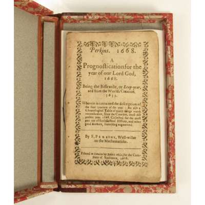 A Prognostication for the year of our Lord God, 1668. London: Robert White, 1668. Small 8vo, unbound, preserved in a morocco-backed marbled box, spine gilt, pp. 48, includes a section entitled "The Anatomy of Man's Body, as the parts thereof are governed by the Twelve Signs" with a woodcut illustration, the first 14pp are printed in red and black, some sections are in black letter, first leaf torn and worn, some chipping and loss, some leaves browned or stained; with a fascinating manuscript diary of 11 pages, dealing with sporting activities and with fowling in particular "Killed with GF two b[race] of P[artridge], one in Coxes further ground near Rad-Meddow, another beyond Fernall Heath near Nurtons.."