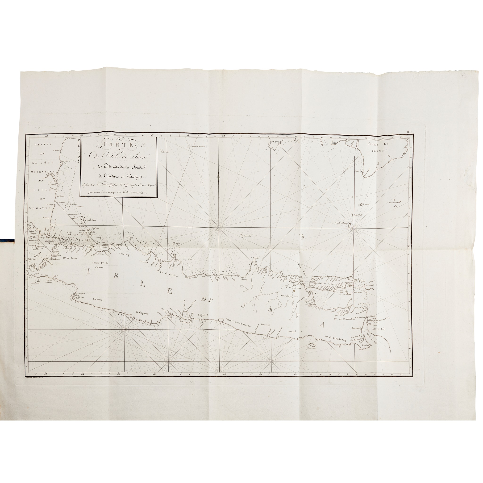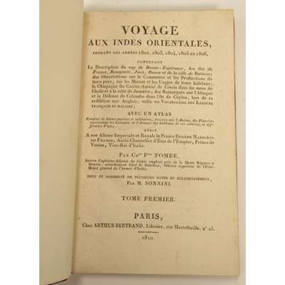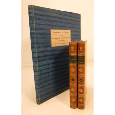 Paris: Arthus Bertrand, 1810. First Edition, 3 volumes, comprising 2 volumes text, 8vo, and atlas volume 4to, with 18 engraved plates and maps (some folding), text in contemporary speckled calf gilt, atlas in contemporary blue patterned paper, lacking half-titles (3)