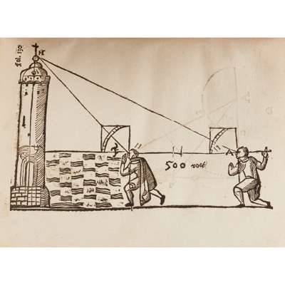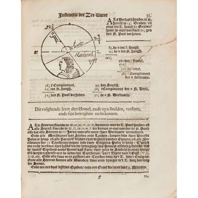 Rotterdam: Abraham Migoen, 1610. Small 4to, second edition, many woodcut illustrations (no volvelles are called for in the second edition), 17th century vellum, early ownership inscription (dated 1676) of a Willem Cornelis to free-endpaper, ownership labels and a stamp of Mevrouw A.D. van der Poest Clement de Graaff to the upper cover and free-endpaper, closed tear to one leaf, some very slight initial dampstaining