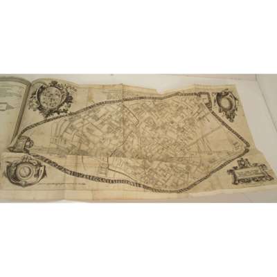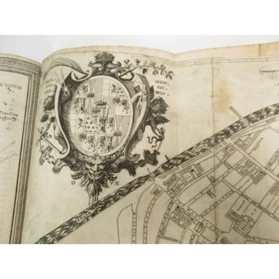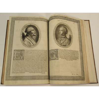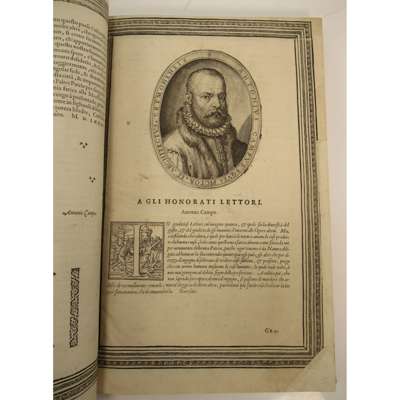 Cremona: Ippolito Tromba and Ercoliano Bartoli, 1585. Folio, 4 parts in one volume, engraved title-page with engraved portrait of Philip II on verso, woodcut initials, decorative woodcut borders, engraved and woodcut illustrations (mostly portraits), folding engraved map, double-page engraved map, double-page engraved plate (of the cathedral) with further engraved details on versos, later speckled calf, leaf ***4 possibly from a later printing, text at foot of 8*3v obscured, without blank leaf 10*4, woodcut printer's device above colophon, first few leaves and final leaf repaired at edges, engraving on verso of title-page shaved, folding map laid down and slightly damaged, double-page plate slightly torn, joints cracked, binding slightly rubbed [Edit16 8843; IA 130.903; Mortimer, Harvard Italian 100]