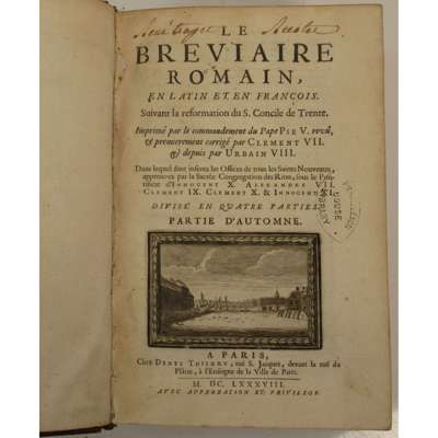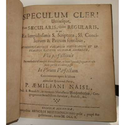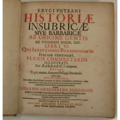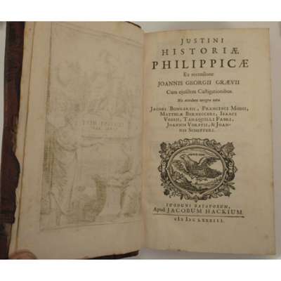 Naisl, A. Speculum Cleri Ultriusque. Cologne: A. Metternich, 1710. 4to, 3 parts in one volume, contemporary embossed pigskin over wooden boards, somewhat spotted; Van der Putte, Hendrik Historiae Insubricae sive Barbaricae ab origine gentis... Frankfurt & Leipzig: J. Grossius, [1678], 4to, contemporary vellum, somewhat spotted, slight wear to vellum fore-edge; [Breviary] Le Brevaire Romain. Paris: D. Thierry, 1688. 8vo, parallel text in Latin & French, contemporary calf, g.e., extremities slightly rubbed; De Sousa, J. Documentos Arabicos para a historia Portugueza copiados dos Originaes. Lisbon, 1790. First edition, 8vo, text in Arabic and Portuguese, owner's name on small slip affixed to title, contemporary tree calf; Pagnino, Santi Epitome thesauri linguae sanctae. Antwerp: Ex officina Plantiniana, 1590. 8vo, [395pp], contemporary vellum, fore margin of title worn with loss of a few letters on verso, contemporary vellum, some dampstaining, binding slightly bowed, Justinian. Historiae Philippicae. Leiden, J. Hackius, 1683. 8vo, frontispiece, contemporary calf, spine gilt; Sirmond, Antoine De immortalitate animae. Paris: G. Losse, 1635. 8vo, contemporary vellum, some spotting and light soiling, contemporary vellum, binding somewhat soiled, [USTC 6003723]; sold not subject to return (7)