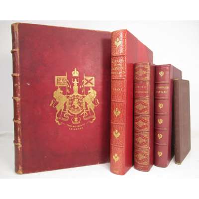 Vestiarium Scoticum. Edinburgh: W. Tait, 1842. Folio, 76 coloured plates, red morocco gilt with arms of the Stuarts on covers, a little dampstaining at end, slightly rubbed; Grant, James The Tartans of the Clans of Scotland. Edinburgh, 1886. Folio, frontispiece, 71 coloured plates of tartans, modern red half morocco by Sotheran's, spine gilt, t.e.g.; Smith, William and Andrew, publishers Authenticated Tartans of the Clans and Families of Scotland. Mauchline, 1850. 4to, hand-coloured map & 68 coloured plates of tartans, modern maroon half morocco gilt, occasional spotting; Account of the Clan-Iver. Aberdeen, 1873, limited to 150 copies, presentation copy to Robert Sutherland from the author, small repair to title, original cloth; Profeit, R.A. Under Locnhagar. Aberdeen, 1894. 4to, number 197 of 200 copies, plates, red half morocco by Bickers, spine gilt, t.e.g. (5)