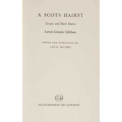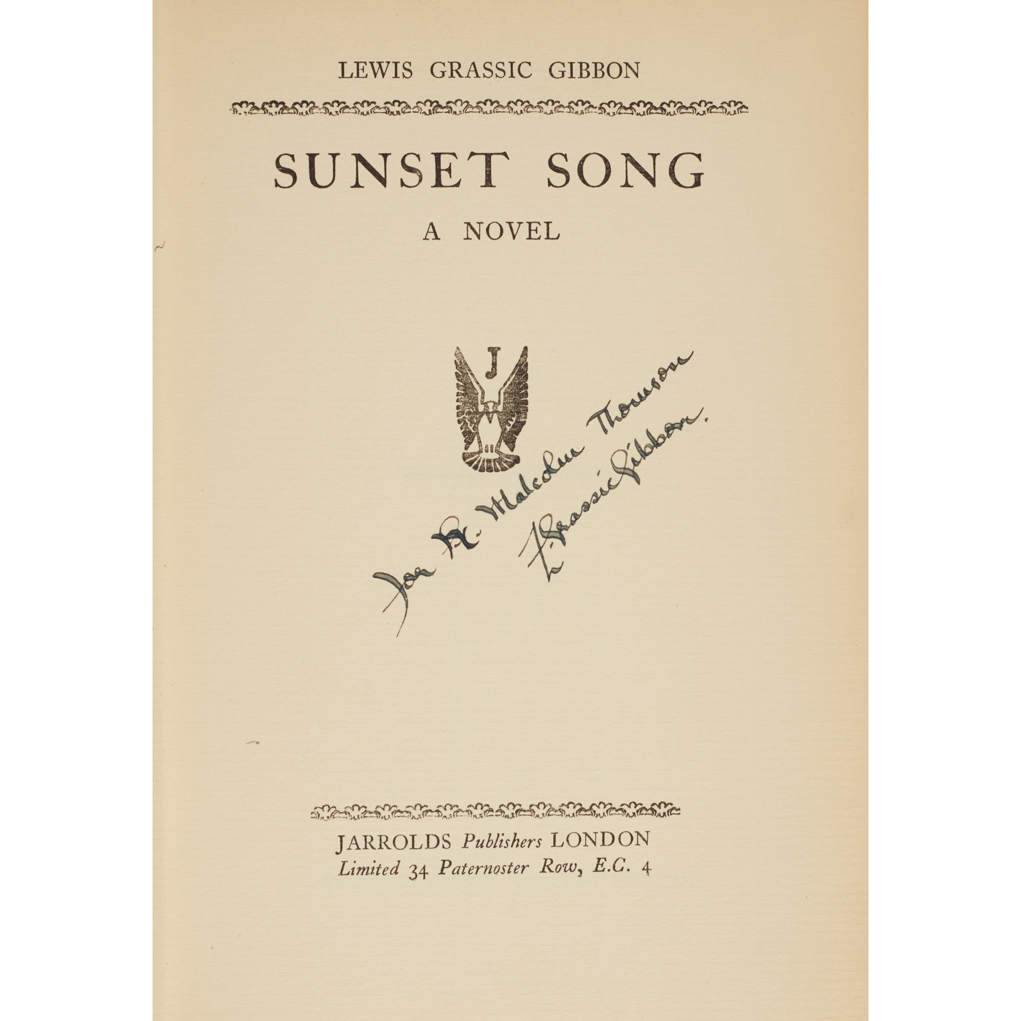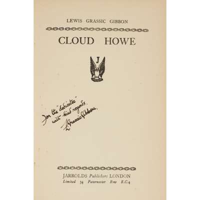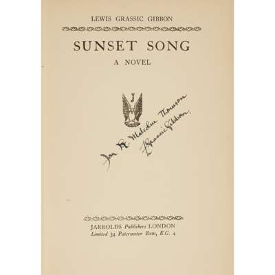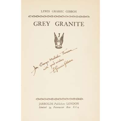 Sunset Song. London: Jarrolds, [1932]. First edition, 8vo, signed and inscribed to title-page: "For G. Malcolm Thomson, L. Grassic Gibbon." (George Malcolm Thomson being the dedicatee of Cloud Howe); [Idem] Cloud Howe. London: Jarrolds, [1933]. First edition, 8vo, signed and inscribed to title-page: "For the "dedicatee" with kind regards. L. Grassic Gibbon."; [Idem] Grey Granite. London: Jarrolds, [1934]. First edition, 8vo, signed and inscribed to title-page: "For George Malcolm Thomson with good wishes L. Grassic Gibbon."; all in original black cloth, faded gilt titles to spines; [Idem] A Scots Hairst. London: Hutchinson, [1967]. First edition, 8vo, with two loosely inserted ALS from Grassic Gibbon's wife, Ray Mitchell, and her signature to the free-endpaper, original blue cloth gilt, dust-jacket not price-clipped (4)