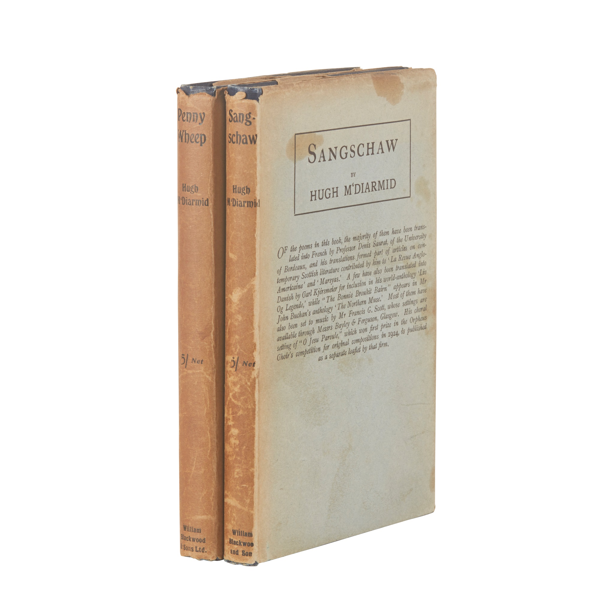 Sangschaw. Edinburgh: W. Blackwood, 1925. First edition, inscribed to N.M. Gunn with 2 verse stanza "I ken a glug hole..", and 1 page A.L.S. to Gunn, stating "The novel will be alright", original blue cloth, dustwrapper slightly stained, discoloured and rubbed; [Idem] Penny Wheep. Edinburgh: W. Blackwood, 1926. First edition, inscribed to Neil M. Gunn, with humorous verse inscription, original blue cloth, dustwrapper spine discoloured and slightly rubbed (2)