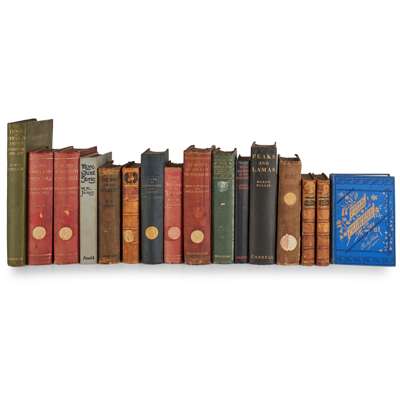 The War of the Worlds. London: W. Heinemann, 1898, first edition, half-title, without the 32pp. advertisements at end (found in the 1st issue), lacks front free endpaper, binding worn and with old paper label to foot of upper cover, internally some spots and stains and rather grubby; Collier, V.W.F. Dogs of China & Japan in Nature and Art. 1921. 4to, original green cloth gilt; Hardy, Thomas Wessex Tales. London: Macmillan, 1888. First edition, 2 volumes, 8vo, contemporary half calf, some spotting and soiling, rubbed; Pallis, Marco Peaks and Lamas. 1939, original cloth; Thomas, Lowell With Allenby in the Holy Land. 1938, original cloth; Stebbing, E.P. Stalks in the Himalaya. 1912, original pictorial cloth, slightly rubbed; James, M.R. More Ghost Stories of an Antiquary. 1916. 3rd impression, original grey pictorial cloth; Barnardo, Mrs. Memoirs of the late Dr. Barnardo. 1907, original cloth; Blaikie, W.G. The Personal Life of David Livingstone. 1881. Second edition, frontispiece portrait, folding map, contemporary cloth; Gordon, Mrs. The Home Life of Sir David Brewster. 1869, albumen print frontispiece, contemporary half calf, some dust-soiling; Slatin, R.C. Fire and Sword in the Sudan. 1898, popular edition, plates, original cloth; Churchill, Winston S. Lord Randolph Churchill. 1906, first edition, 2 volumes, plates, original cloth, Mudie's Library labels to upper covers, somewhat shaken, spines faded, front free endpaper detached; Hibberd, Shirley Field Flowers, a handy-book... Groombridge, [n.d.], coloured plates, original blue cloth gilt; Cumming, C.F.G. Fire Fountains. the Kingdom of Hawaii. 1883. volume 2 only, original cloth, very worn, lacks f.f.e.p., all with Earlston Community Reading Room and Circulating Library bookplates (16)