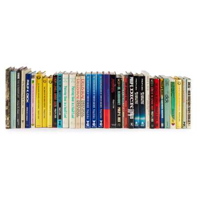 The Man in the High Castle. London: Victor Gollancz, 1975. First UK hardback edition, 8vo, original blue cloth gilt, dust-jacket not price-clipped; Valis. Surrey: Kerosina Books, 1987. First hardback edition, 8vo, original back cloth gilt, dust-jacket not price-clipped; Radio Free Albermuth. New York: Arbor House, 1985. First edition, 8vo, original blue cloth, dust-jacket not price-clipped; and another copy; Puttering About in a Small Land. Chicago: Academy Chicago, 1985. 8vo, original terracotta cloth gilt, dust-jacket not price-clipped; and another copy; The Crack in Space. Surrey/New York: Severn House, 1989. 8vo, original black cloth gilt, dust-jacket not price-clipped; The Ganymede Takeover. London: Severn House, 1988. 8vo, original blue cloth gilt, dust-jacket not price-clipped; Galactic Pot-Healer. London: Victor Gollancz Ltd, 1971. 8vo, original red cloth, dust-jacket not price-clipped; The Transmigration of Timothy Archer. New York: Timescape Books, 1982. First edition, 8vo, original quarter cloth, dust-jacket not price-clipped; and 3 copies of the UK edition; Deus Irae. New York: Doubleday & Company, 1976. First edition, 8vo, original black cloth, dust-jacket not price-clipped; and another copy; and 7 other hardback titles; 6 further paperback titles; and 7 bibliographical works relating to Philip K. Dick (35)