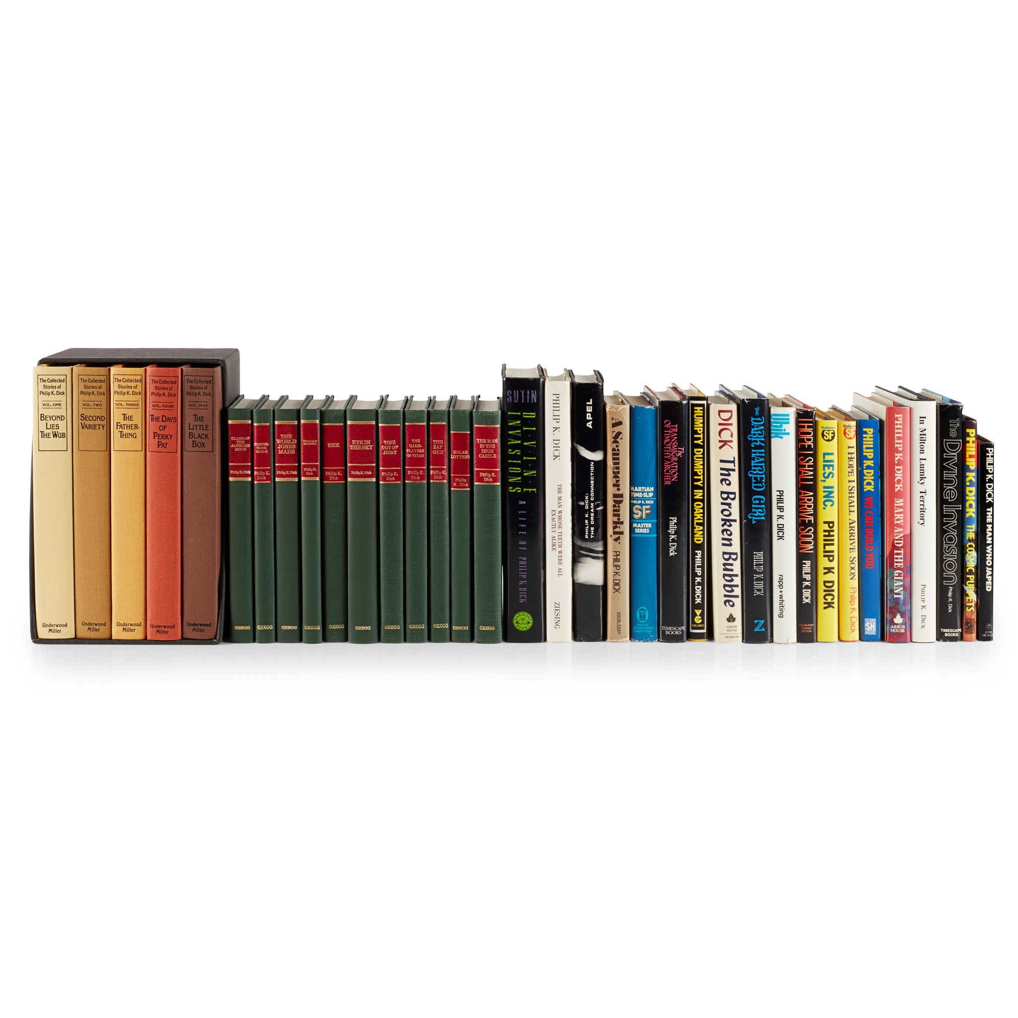 A Scanner Darkly. New York: Doubleday & Company Inc., 1977. First edition, 8vo, original cloth, dust-jacket not price-clipped, stamp to endpaper; Martian Time-Slip. London: New English Library, 1976. 8vo, original blue cloth gilt, dust-jacket not price-clipped; Humpty Dumpty in Oakland. London: Victor Golancz Ltd., 1986. First UK edition, original yellow cloth gilt, dust-jacket not price-clipped; The Divine Invasion. New York: Timescape Books, 1981. First edition, 8vo, original blue cloth gilt, some crumpling to dust-jacket but not price-clipped; Ubik. Exeter: A. Wheaton & Co., 1970. First UK edition, 8vo, original cloth, price-clipped dust-jacket; We Can Build You. London: Svern House Publishers Ltd, 1972. 8vo, original blue cloth gilt, dust-jacket not price-clipped; I Hope I Shall Arrive Soon. New York: Doubleday & Company, Inc., 1985. First edition, 8vo, original cloth, dust-jacket not price-clipped; The Dark Haired Girl. Connecticut: Mark V. Ziesing, 1988. First edition, 8vo, original blue cloth gilt, dust-jacket not price-clipped; The Transmigration of Timothy Archer. New York: Timescape Books, 1982. First edition, 8vo, original cloth, dust-jacket not price-clipped; The Broken Bubble. New York: Arbor House, 1988. First edition, 8vo, dust-jacket not price-clipped; The Collected Stories of Philip K. Dick. Los Angeles: Underwood/Miller, 1987. 5 volumes, 8vo, original cloth in box; 11 Greg Press editions of Dick's works in original green cloth; and 9 others (35)