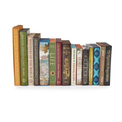 Magie, David, translator Lives of the Later Caesars, 2005. 8vo, grey morocco gilt, slipcase; Nielsen, Kay, illustrator East of the Sun West of the Moon, 2000. 8vo, original Japanese vellum gilt, slipcase; Wood, Frances The Silk Road, 2002. 8vo, original silk gilt, slipcase; Grahame, Kenneth The Wind in the Willows, 1995. 8vo, original green watered silk gilt, slipcase; Magnusson, Magnus, editor The Icelandic Sagas, 1999. 8vo, original quarter calf gilt, slipcases; Milton, John Paradise Lost, 2003. Folio, original green quarter morocco over peach silk, slipcase; The Book of Kells, 1974. Folio, original orange silk gilt, slipcase; and a large quantity of others (94)