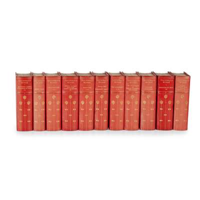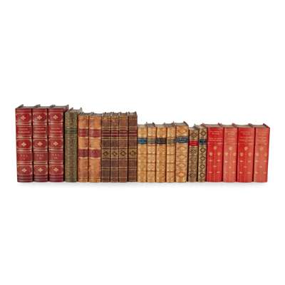 Thackeray, William Makepeace The Prose Works. London: J.M. Dent & Co., 1901-1903. 8vo, bound in 15 volumes in red half-calf gilt by Bayntun; Cooper, J. Fenimore The Last of the Mohicans. London: Cassell & Company, Limited, [n.d.] 8vo, half calf gilt; Wordsworth, William The Complete Poetical Works. London: Macmillan and Co., 1889. 8vo, contemporary tree calf gilt; Hanson, Charles Henry Stories of the Days of King Arthur. London: T. Nelson and Sons, 1887. 8vo, contemporary deep moroon calf gilt; Defoe, Daniel The Life and Surprising Adventures of Robinson Crusoe... London: Chatto & Windus, 1890. 8vo, contemporary deep moroon calf gilt; Beloe, William Herodotus, translated from the Greek. London: Leigh and S. Sotheby, 1806. 4 volumes, 8vo, contemporary half calf gilt; Chambers Chambers's Encyclopaedia. London: W. and R. Chambers, 1882. Volumes 1-10, revised edition, large 8vo, half calf; The London Stage London: Sherwood and Co., [n.d.] 4 volumes, 8vo, half calf; English Translations From Ancient and Modern Poems. London: J. Johnson..., 1810. 3 volumes, large 8vo, later crushed red half morocco gilt; and a quantity of others by Bulwer, Scott, Goldsmith and others, sold not subject to return
