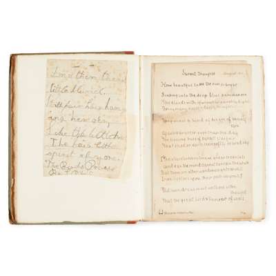 Note: Lettice Barbara Hay Shaw lived from 1887-1904, passing away aged 17 and leaving behind a remarkable amount of writings. This copy of her work is notable owing to the number of letters and autograph poems by Hay Shaw loosely inserted, written over a number of years with the handwriting developing from that of a small child to that of an older teenager.