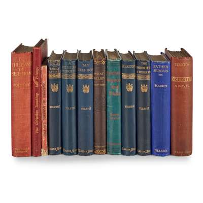 What I Believe. London: Elliot Stock, 1885. First edition, 8vo, brown cloth gilt, slight wear to edges of spine and cover corners, small tear between spine and pages at end, inscribed 'Aberdeen Philosophical Soc 3/9/86' in pencil inside front cover; [Idem] Childhood, Boyhood, and Youth. London: Vizetelly & Co, 1888. First edition re-issue, 8vo, portrait, blue cloth gilt, slight wear to edges of spine; [Idem] A Russian Proprietor. London: Walter Scott, 1888. First edition, 8vo, blue cloth gilt, slight wear at head and base of spine; [Idem] My Religion. London: Walter Scott, 1889. 8vo, blue cloth gilt; [Idem] Sevastopol. London: Walter Scott. 8vo, blue cloth gilt, slight foxing inside front and back covers; [Idem] The Kingdom of God is Within You. London: Walter Scott, 1894. 8vo, blue cloth gilt, slight foxing inside front cover; [Idem] Father Sergius and Other Stories. London, Edinburgh, Dublin, Leeds, New York: Thomas Nelson and Sons, 1911. 8vo, 1 plate, blue cloth gilt, a few pages slightly torn, slight foxing and browning inside front and back covers, bookplate of Stephen M. Renna; [Idem] The Christian Teaching. London: Horace Marshall & Son, 1898. First edition, 8vo, red cloth gilt, some wear to spine, slight browning to pages, name of owner inscribed in ink inside front cover and some passages highlighted and annotated pencil throughout; [Idem] Resurrection. London: Francis Riddell Henderson, 1900. Second edition, 8vo, 23 plates, red cloth gilt, faded spine and foxing and slight foxing and browning to some pages; [Idem] In the Days of Serfdom and Other Stories. London: Constable & Co LTD, 1911. First edition, 8vo, foxing to edges, browning inside front and back covers, [Idem] The Dominion of Darkness. London: Vizetelly & co, 1888. First edition, 8vo, original paper wrappers, covers slightly frayed and chipped, front and back interior pages slightly browned, some folding creases to back cover and back interior pages (12)