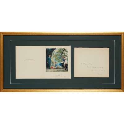 with a photograph showing the Queen, the Duke of Edinburgh, Prince Charles and Princess Anne as small children sitting under a tree canopy with corgis, signed 'Elizabeth R.' 1957, 39 x 24cm, with accompanying envelope, framed and glazed