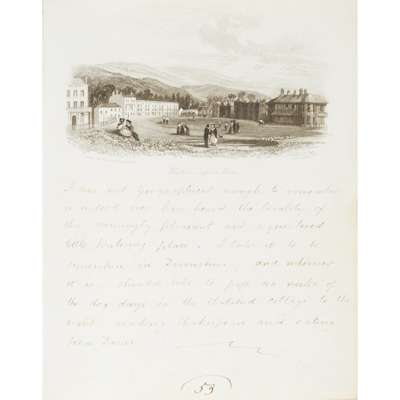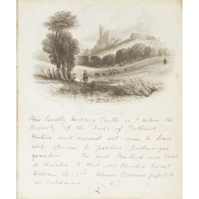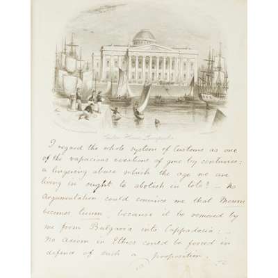each with considered commentary: "Weston Super Mare." 'I am not geographical enough to remember, or indeed ever have heard the locality of this seemingly pleasant and sequestered little Watering place. I take it to be somewhere in Devonshire, and wherever it is, should like to pass six weeks of the dog days in the thatched cottage to the right, reading Shakespeare and eating John Dories', Warwick Castle 'the most enviable residence in the whole world', Box Tunnel at Bath 'these Railway tunnels equal, if they do not surpass, the most stupendous memorials of antiquity!'; Cheltenham Propitiatory College 'no smack of antiquity. An F.S.A. should have known much better how to imitate the stile of a middle age! There is too much lightness of pediment, too much window, too much gingerbread turretting!', c. 360 pages, lacking first 4 pages, half calf, rubbed, lacks spine, [c.1850]