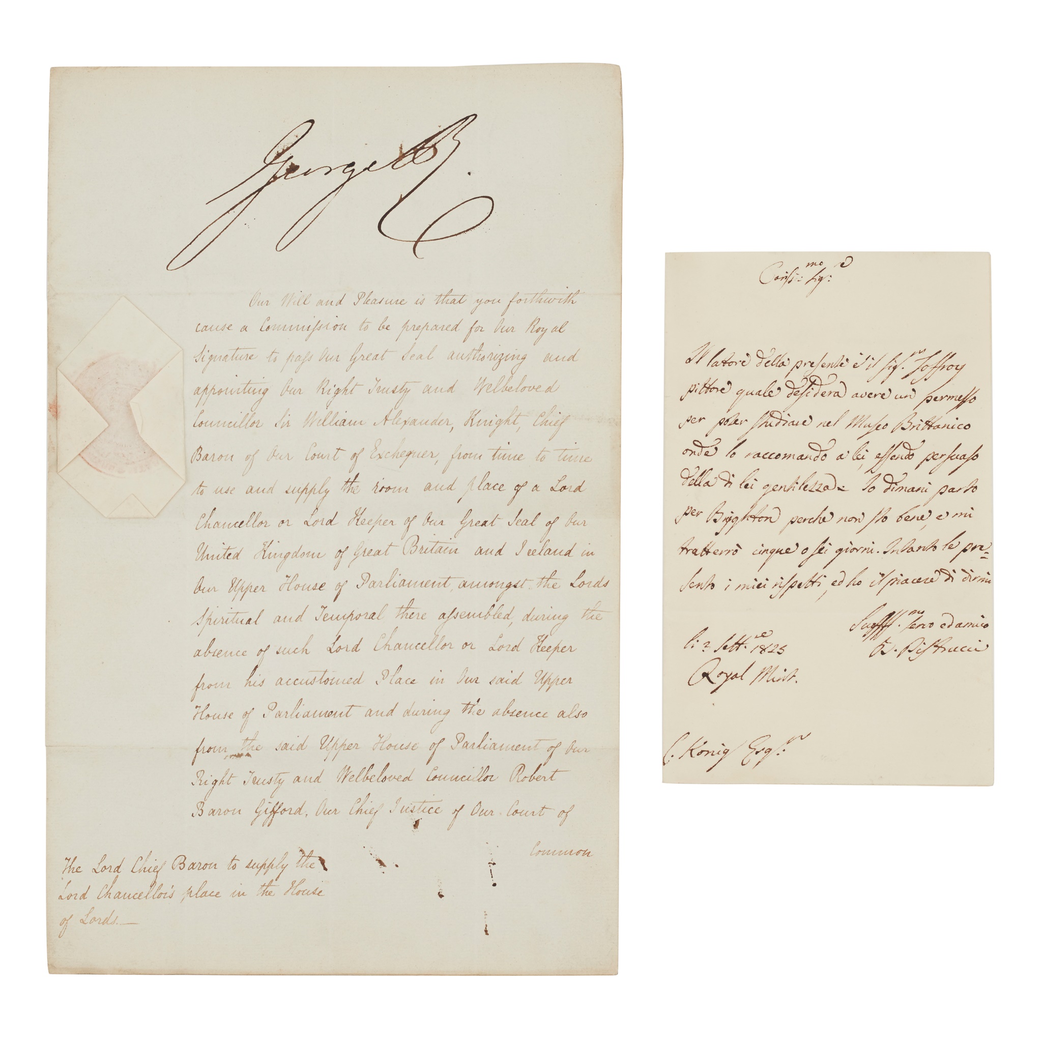 written on paper in a secretarial (or Peel's?) hand, instructing the preparation of a document authorising Sir William Alexander to, from time to time, "use and supply the ? and place of a Lord Chancellor or Lord Keeper of our Great Seal...in Our Upper House of Parliament...", folded folio, 31.5 x 20cm, signed 'George R.' to the upper margin, and signed Robert Peel at the end, undated