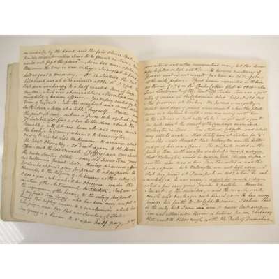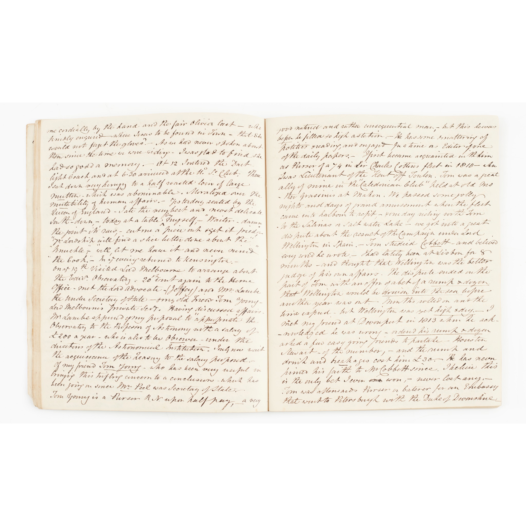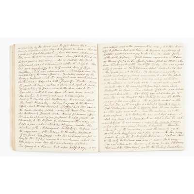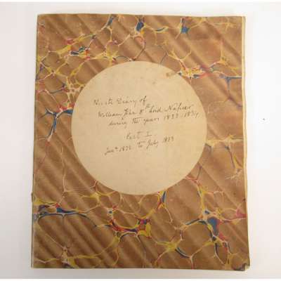 during the years 1833-1834, "Part 1 Jan. 2 1833 to July 1833", 4to, c. 80 pages, inscribed on front endpaper "Most Private & Confidential. Log Book 1833", a very interesting and candid diary discussing family, politics, friends, "Dundonald is at this time very busy at Glasgow perfecting his Steam-engine, and making experiments on the expansion of gas with the ultimate view of applying it in the room of steam", conversations with the King at St. James's Palace", "Lord Brougham is certainly possessed of a very winning manner and inspite of a monstrous nose which is always twitching about as if to start from his face, has a delightful expression of Countenance, a smile playing upon his lips and his eyes beaming with kindness, intelligence and good humour", discusses his dinner with their Majesties, Palace politics, political votes in the House of Commons and Lords, journey to Brighton 'with my excellent friend Lord Byron', visit to the Brighton Pavilion 'I have often wondered how the King got through his income, but on seeing at 11 o'clock in the day 17 joints roasting on 5 spits all at the same moment, the difficulty was solved. All these went to feed the Servants, for of course His Majesty's dinner came afterwards', observations on electricity, steam-engines, construction or roads and bridges in Scotland, Turnpike acts, &c. bound in contemporary marbled wrappers