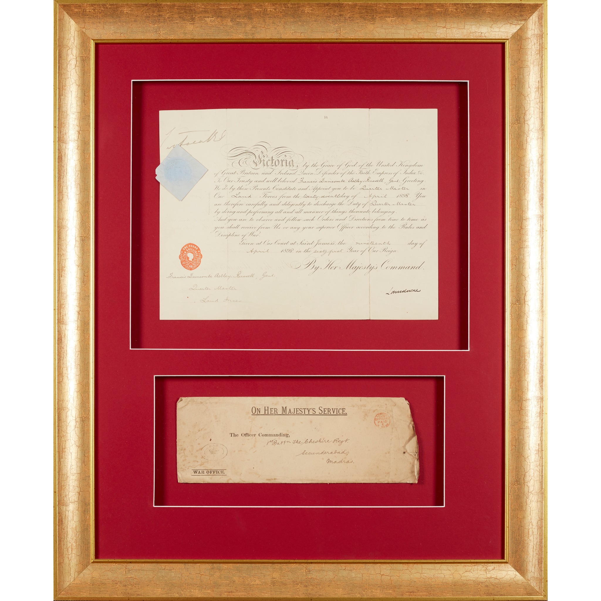 printed and manuscript on paper, 29 x 39cm, framed and glazed with accompanying envelope, appointing to the position of Quarter Master Francis Duncombe Astley-Russell in Her Majesty's Land Forces, dated 19th April 1898, signed Victoria in the upper left corner, countersigned Landsdowne