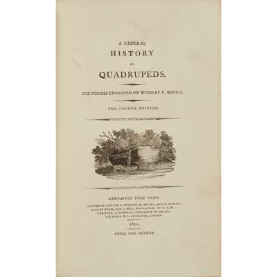 Newcastle: for Beilby & Bewick, 1797-1804, 2 volumes, 8vo, wood-engravings, contemporary half russia, some spotting, joints splitting; Bewick, T. A General History of Quadrupeds… fourth edition. Newcastle, 1800. 8vo, wood-engravings coloured by a later hand, contemporary calf, rebacked, head of spine rubbed; and 4 others (7)